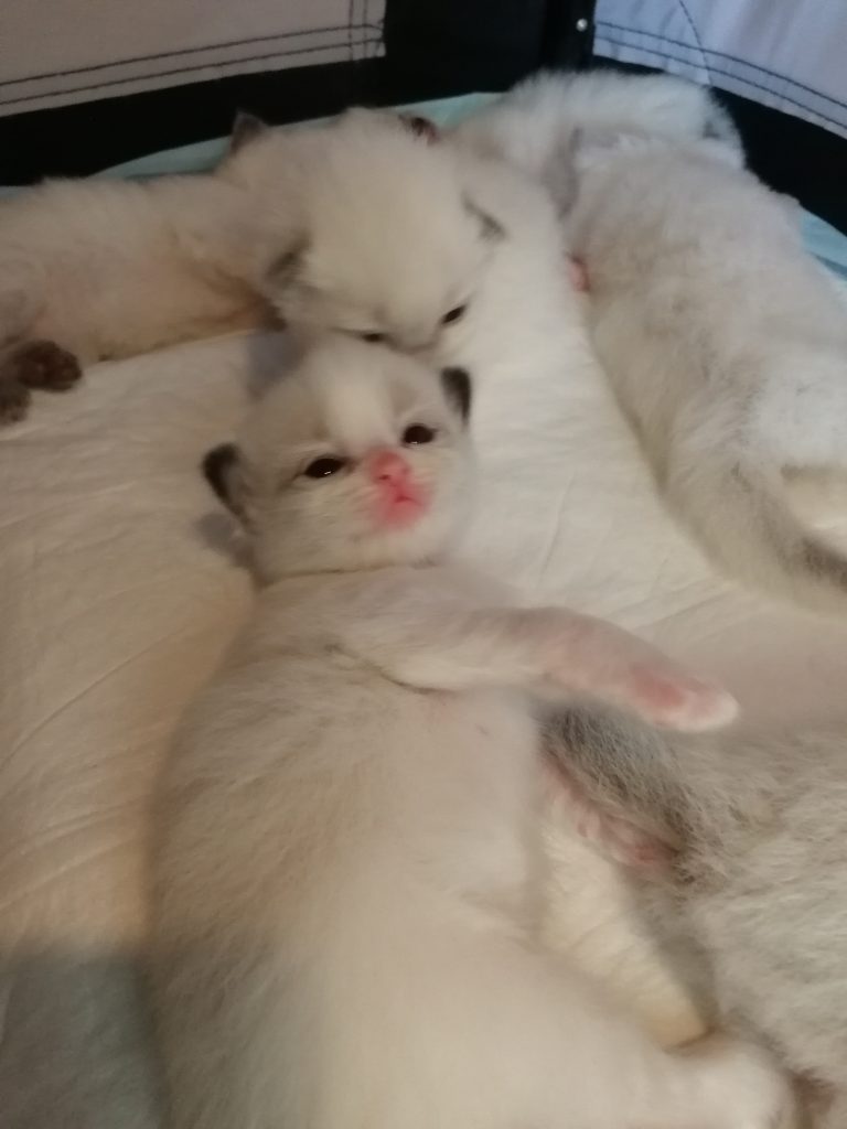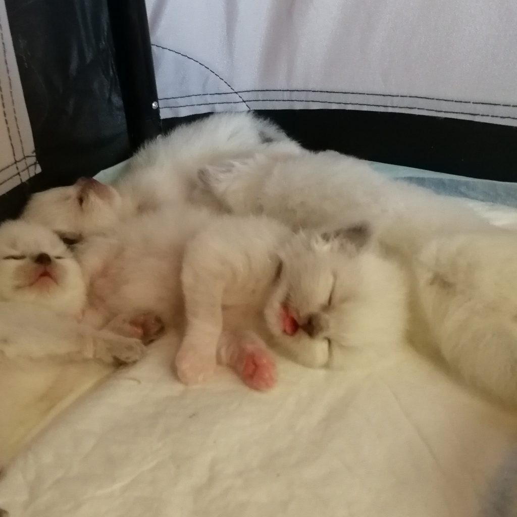 Pennut ovat väriltään sinisiä tai ruskeita (bicolor, mitted ja colorpoint).